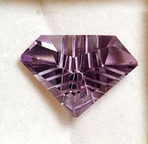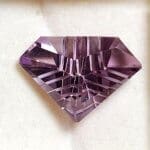 GEM TYPE: Genuine Amethyst WEIGHT: Aprx. 12.88 Carats MEASURES: Aprx. 25.5x15mm CUT: Fantasy Laser Shield Cut CLARITY: Transparent TREATMENT: None (Natural) # OF GEMS: 1 ESTIMATED RETAIL VALUE: $400 CLICK FOR VIDEO ITEM DESCRIPTIONFeatured IS a genuine amethyst. Amethyst is quartz mineral. It can be found in several places on the earth and can be light to dark in color. Most amethyst is translucent. This particular gemstone has a rich "plum" purple color, with a unique fantasy laser cut to enhance its distinct shield shape. Pictured is the actual gemstone being offered. PHOTOS ENLARGED TO SHOW DETAIL