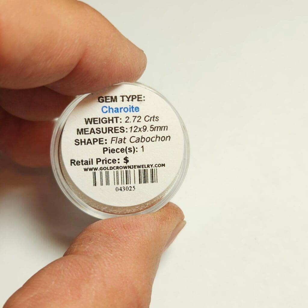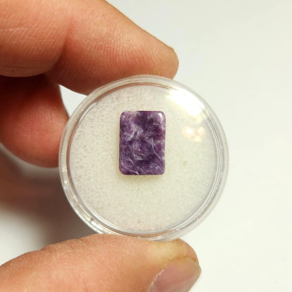 GEM TYPE : Genuine Charoite WEIGHT: Aprx. 2.72 Crts MEASURES: Aprx. 12x9.5mm CUT: Rectangle Flat Cabochon CLARITY: Opaque TREATMENT: None (natural) # OF GEMS PER PARCEL: 1 ESTIMATED RETAIL VALUE: $25 ITEM DESCRIPTIONPictured is the actual gemstone being offered. PHOTOS ENLARGED TO SHOW DETAIL