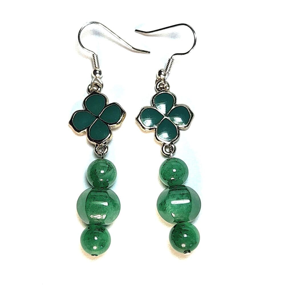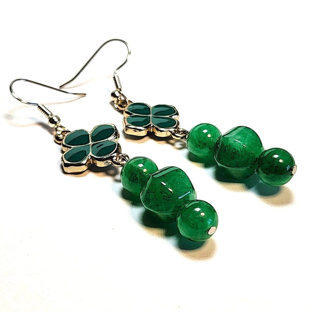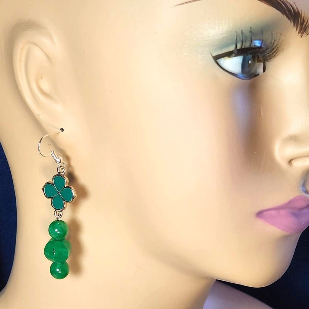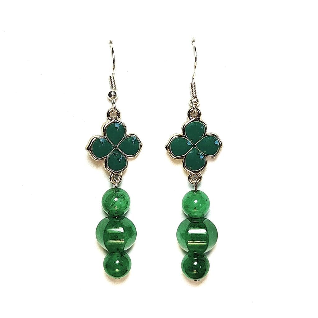 EARRING TYPE : Genuine Japanese Glass Bead GEM SIZE & CUT: (2) 10mm Green Beads ACCENT STONES: (4) 8mm Green Beads MOUNTING: Mixed Metal MEASURES: 3" Long/ 1/2" Wide CLASP : Wire Hook Style ITEM WEIGHT: 11.20 Grams ESTIMATED RETAIL VALUE: $45 CLICK FOR VIDEO ITEM DESCRIPTION Featured are custom earrings using vintage componants. Superb vintage green japanese glass beads, stacked on top of each other, topped with a four-leaf green enamel clover. The earring's silver-tone wire hooks and design componants are made from a mixed of hypoallergenic metals including stainless steel. Pictured is the actual item being offered. PHOTOS ENLARGED TO SHOW DETAIL