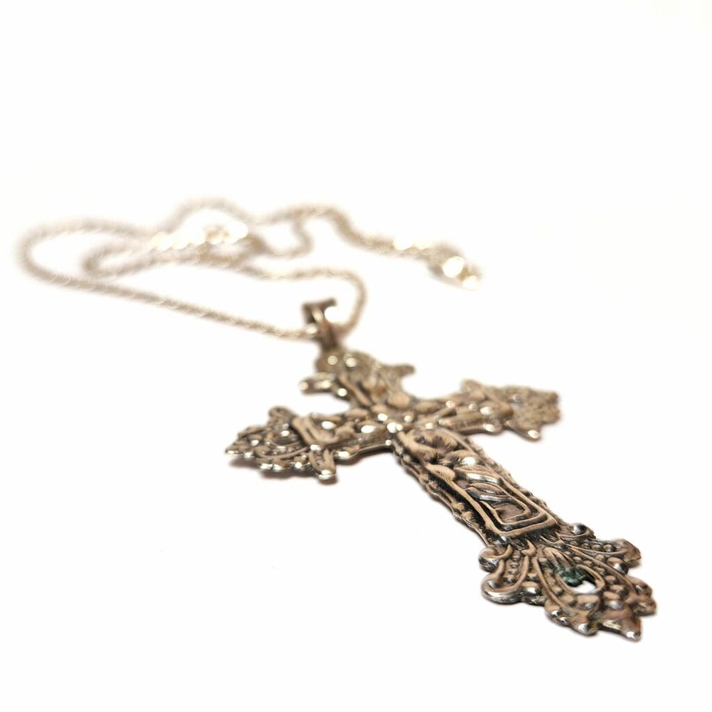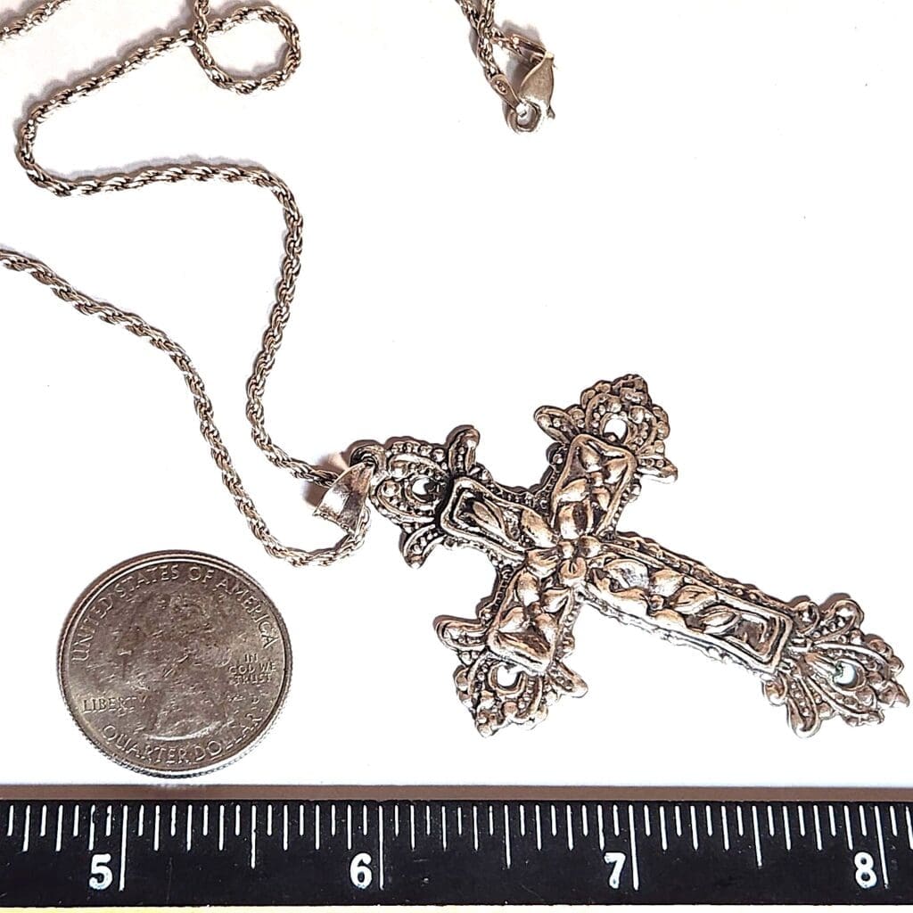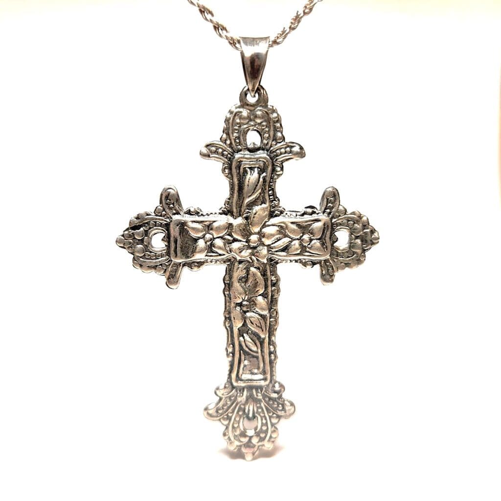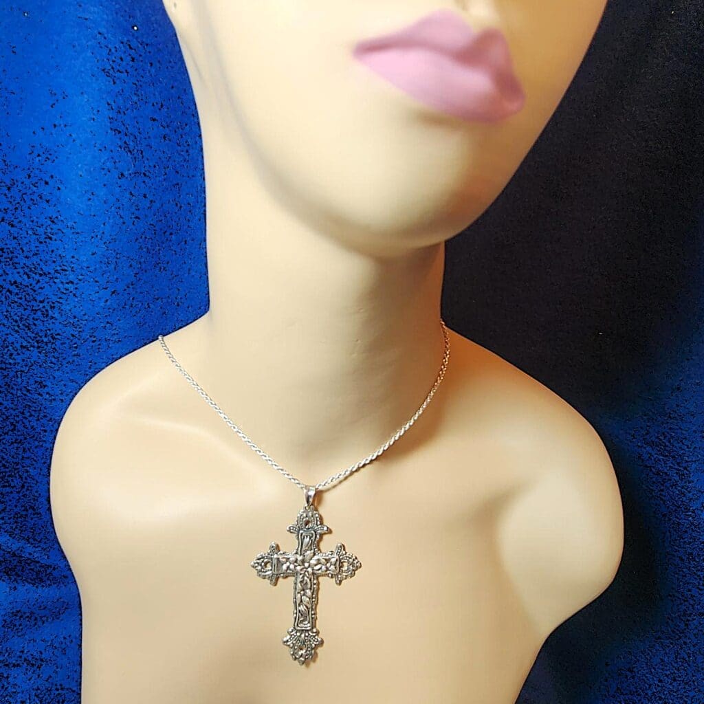 GEM TYPE : None GEM SIZE & CUT : None ACCENT STONES: None METAL TYPE: (2) .925 Silver PENDANT MEASURES: 72.5x43.3mm NECKLACE MEASURES: 18" Inches (1.6mm rope) CLASP: Bale Style ITEM WEIGHT: Aprx. 12.5 Grams ESTIMATED RETAIL VALUE: $240 CLICK FOR VIDEO ITEM DESCRIPIONFeatured is a large floral cross pendant. It's spectacular design features an array of flowers. Both the front and back of the cross are the exact design. The necklace and pendant are crafted in fine .925 sterling sliver, and is brand new, never worn. Pictured is the actual item being offered. PHOTOS ENLARGED TO SHOW DETAIL