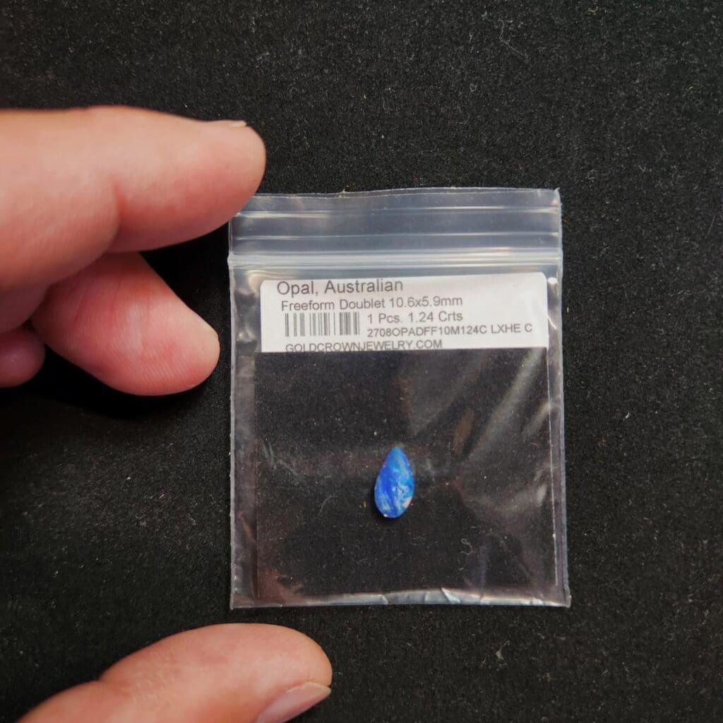 Featured is a genuine Australian Opal. There are a wide variety of Australian opals, from white based with fire, harlequin patterns, top jelly crystal, to clear. Australian opals are renowned for the play of color and distinct features that make them Australian gems. Additionally, opals can be solid opal (all opal), boulder opal (opal in matrix host rock), doublet (a thin slice of opal with a dark backing), triplet (same as a doublet bet typically with a clear quartz top), or mosaic (opal pieces arranged in a pattern and backed like a doublet or triplet).