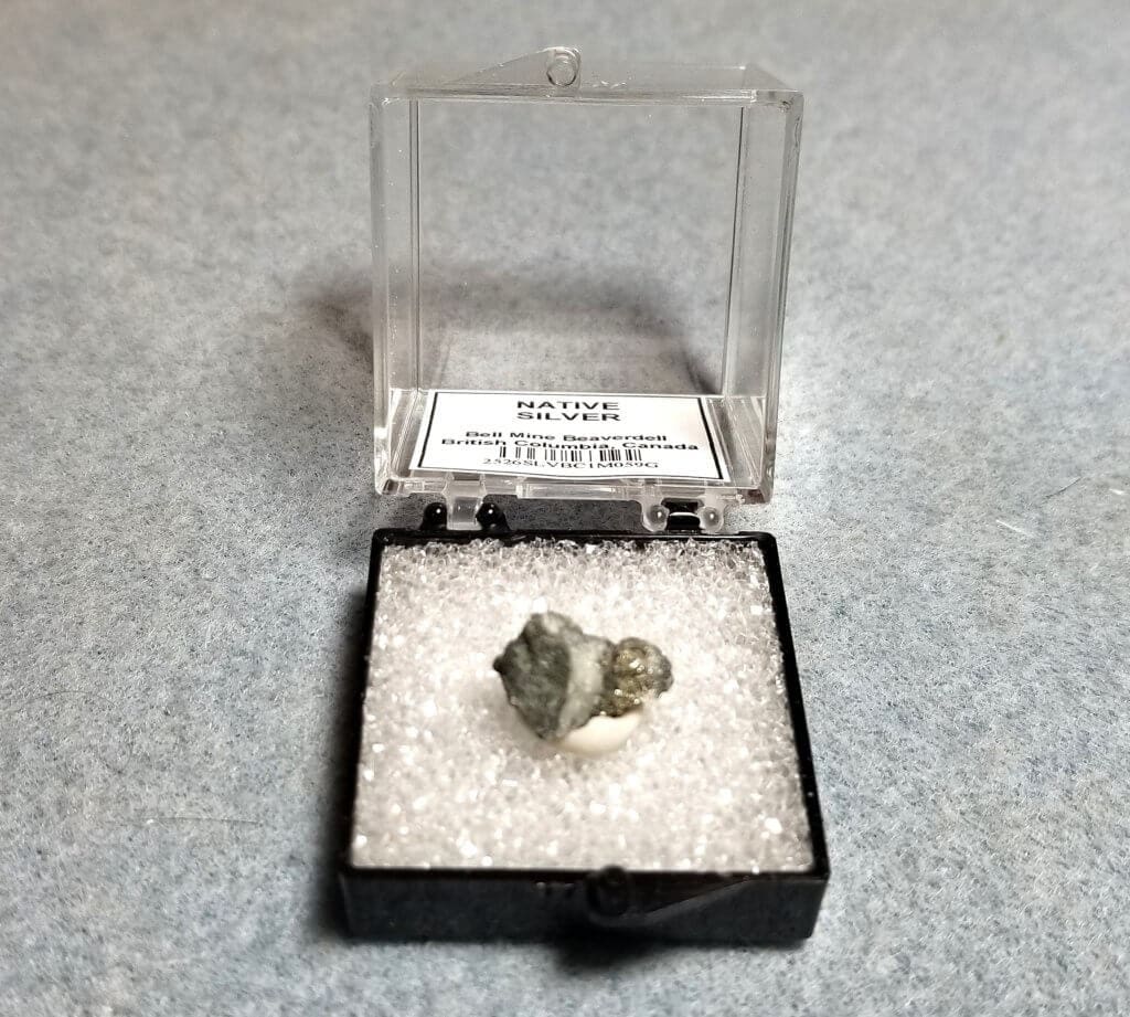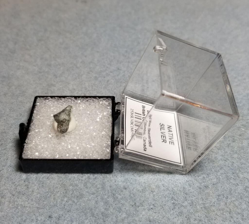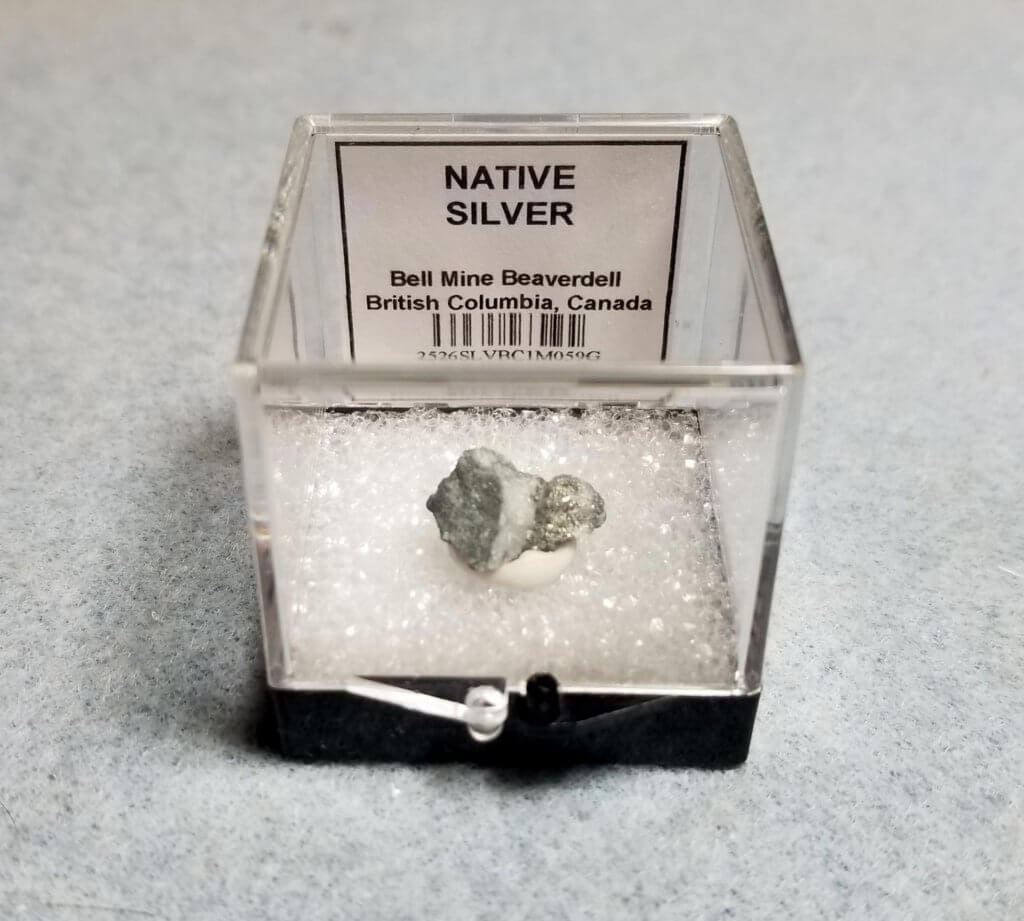 GEM TYPE : Genuine Native Silver WEIGHT: Aprx. 0.59 Grams MEASURES: Aprx. 13.5x9.4mm CUT: Specimen thumbnail CLARITY: Opaque/Reflective TREATMENT: None (Natural) # OF GEMS PER PARCEL: 1 ESTIMATED RETAIL VALUE: $75 CLICK FOR VIDEO ITEM DESCRIPTION Featured is a genuine Native Silver Specimen. Native silver specimens can be found in a wide variety of places on earth. Specimens can have a crystal-like structure or more of patterned "vein" grown in its host rock. Native natural found silver is approximately 0.940 (94%) pure, compared to refined silver which is 0.999 pure. . This particular thumbnail specimen displays a unique vein pattern formation in the center crevasse of the host rock with excellent luster and from the Bell Mine, Beaverdell, British Columbia, Canada. This thumbnail specimen comes with the 1.25" acrylic box case. Pictured is the actual gemstone being offered. PHOTOS ENLARGED TO SHOW DETAIL