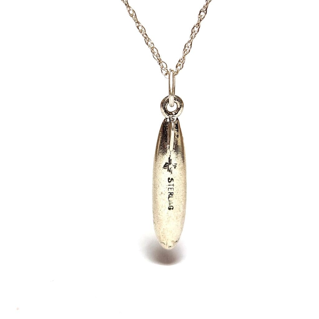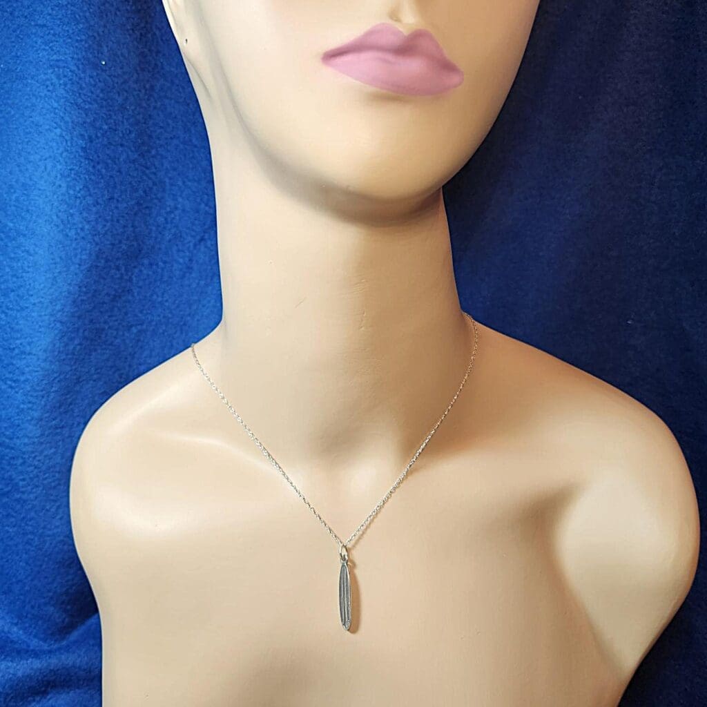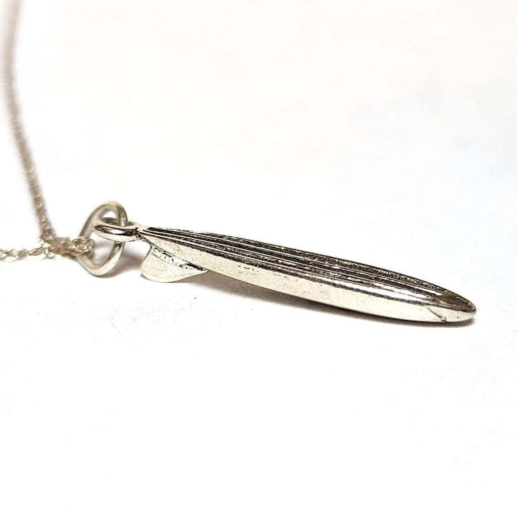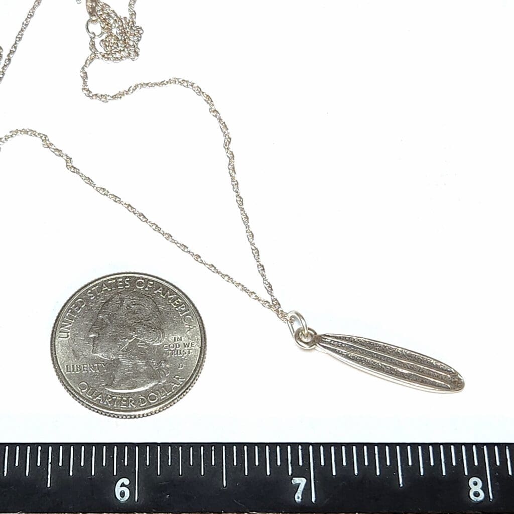 GEM TYPE : None GEM SIZE & CUT : None ACCENT STONES: None METAL TYPE: (2) .925 Silver PENDANT MEASURES: 30x5.75mm NECKLACE MEASURES: 18" Inches (1mm link) CLASP: Ring Style ITEM WEIGHT: Aprx. 2.75 Grams ESTIMATED RETAIL VALUE: $80 CLICK FOR VIDEO ITEM DESCRIPIONFeatured is a super cool surfboard pendant. It's design has a perfect replica of a miniature surfboard, with a dextured deck and fin. The pendant is crafted in fine .925 sterling sliver, with natural patina. The .925 silver necklace is brand new. ABOUT OUR SILVER ESTATE JEWELRYBecause of the variety of preference our customers have in regard to silver estate jewelry, we will lightly clean an item, but not polish it. Some collectors prefer a polished look, while others enjoy the natural aging of the metal (patina) as it is. So we leave the choice up to you. Pictured is the actual item being offered. PHOTOS ENLARGED TO SHOW DETAIL